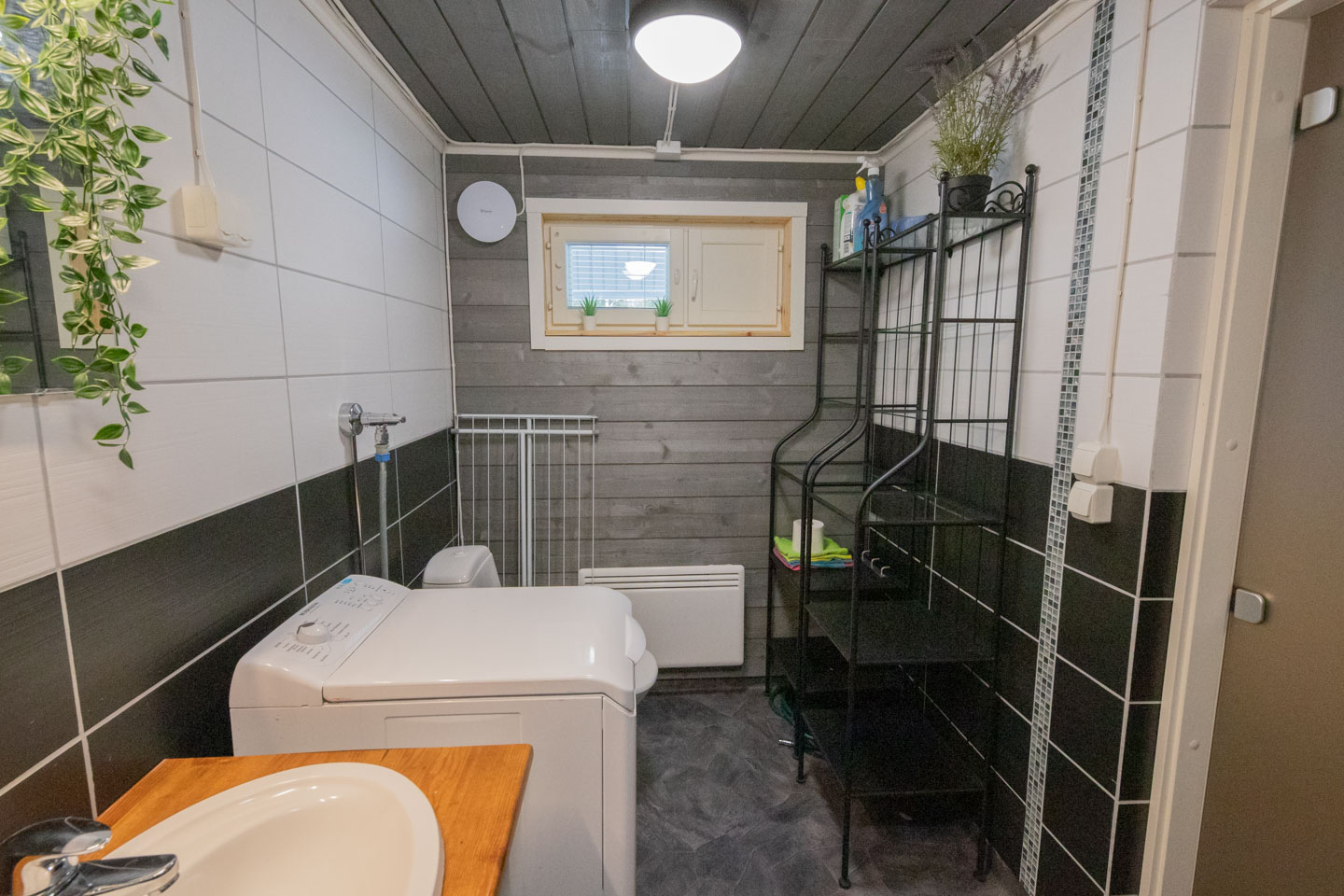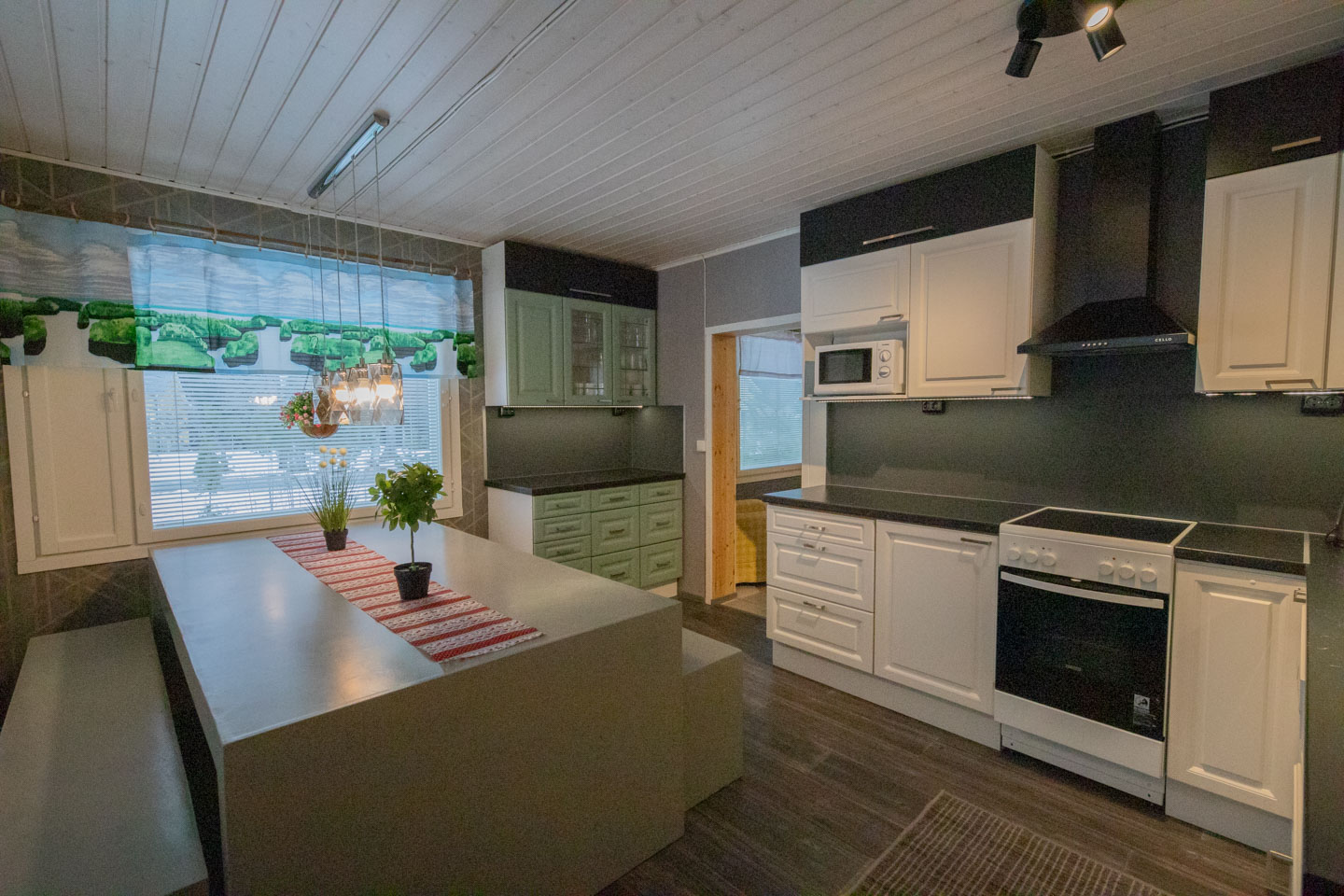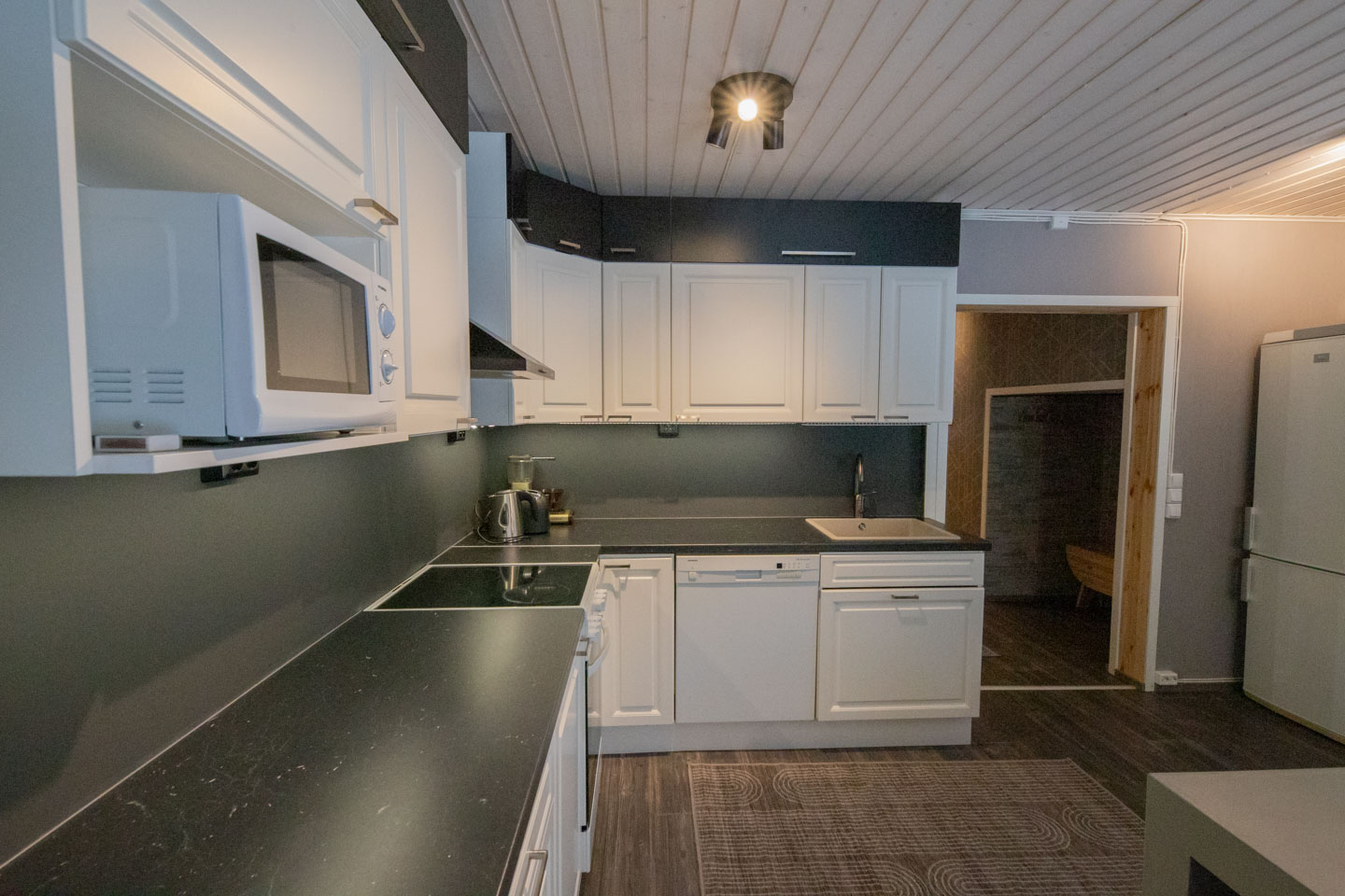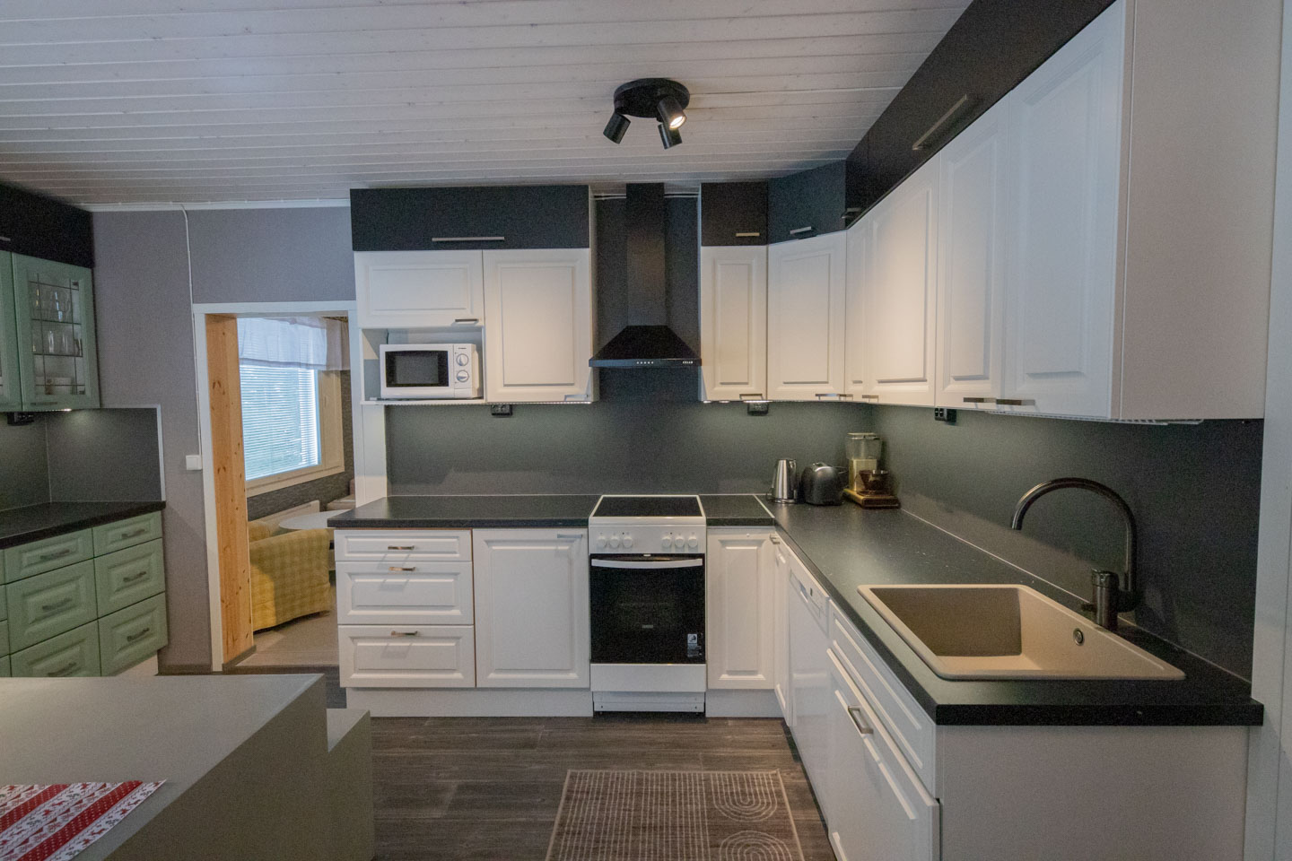 Kylpyhuoneessa pesukone, keittiössä tiskikone, sähköliesi, mikroaaltouuni, kahvinkeitin, vedenkeitin, leivänpaahdin, riittävä määrä ruokailuastioita ja -välineitä sekä ruuanvalmistukseen tarvittavat välineet.